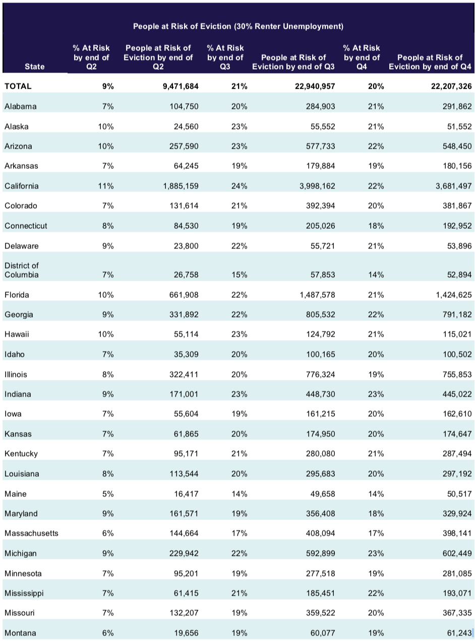 CEDP co-founder Sam Gilman reached the estimate by building a model that incorporated data on renter households’ income, savings, and housing cost burdens (a household is cost-burdened if they spend more than 30 percent of their income on housing costs such as rent or mortgage, utilities, insurance, taxes, and maintenance). The model also accounted for new income through stimulus payments, enhanced unemployment insurance, and state unemployment insurance in each of the 50 states and Washington, DC. This allowed the organization to predict how many renters are at risk depending on the level of unemployment renters are experiencing. If their unemployment rate is 25 percent, 19 million people would be at risk of eviction by September 30, as their unemployment benefits expire, stimulus payments are spent, and savings dwindle; that rises to 23 million if renters’ unemployment rate is 30 percent.