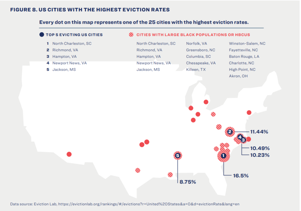The pain of eviction is not evenly distributed. Data indicate that both geography and discrimination play significant roles. Tenants’ rights and eviction laws vary widely. Some areas of the country are eviction hotspots. Of the 25 large US cities with the highest eviction rates, six are located in Virginia and five in North Carolina. Racial discrimination is evident, as Black and Latinx people, particularly mothers and their kids, are the most likely to experience eviction. Other groups who suffer from high rates of eviction include people who are disabled, were formerly incarcerated, are undocumented, and/or are LGBTQ.
