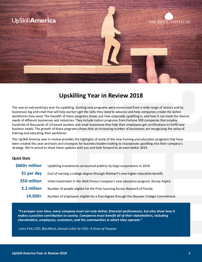In 2018, we released new tools and research to help businesses improve job quality. After several years of development and testing, the Good Companies/Good Jobs Initiative launched the Working Metrics tool. We also shared learnings from partnerships between business and worker training organizations, such as BEST and the Omni Parker House in Boston, a collaboration that supports a “good jobs” strategy in hospitality, and Pete’s Fresh Market and Instituto del Progreso Latino, organizations working together in Chicago to help food retail workers advance in their careers. We learned from a range of major corporations that are investing in upskilling their frontline workforce and creating advancement opportunities for those who need them most, and we created new tools and added to the UpSkilling Playbook for Employers so more companies can participate in the upskilling movement.