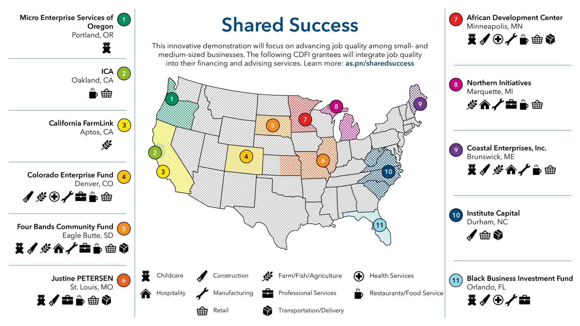 Organizations involved in Shared Success are finding ways to leverage existing core elements of their programs — such as one-on-one advising, trainings, tools, and partners — to incorporate job quality. We are using insights gained from these CDFIs to develop a range of tools and resources designed to help you integrate job quality into your advisory work, including practical guides and resources for business coaches and small businesses. If you’re looking to get started, you don’t have to build your job quality capacity from scratch. The Shared Success demonstration is committed to supporting you in this journey.