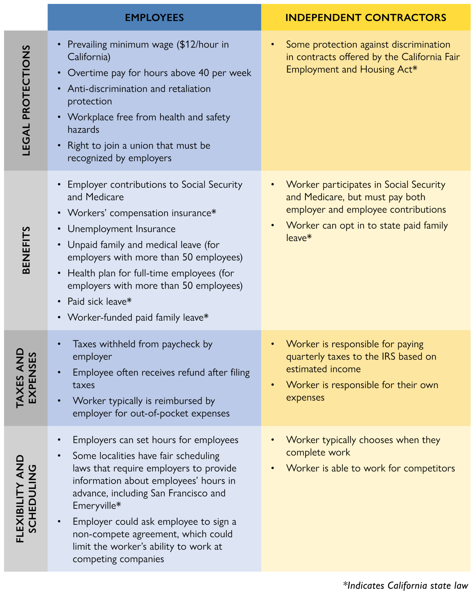 Being classified as an employee guarantees a worker a range of benefits and protections that are not offered to independent contractors, summarized in the chart below.