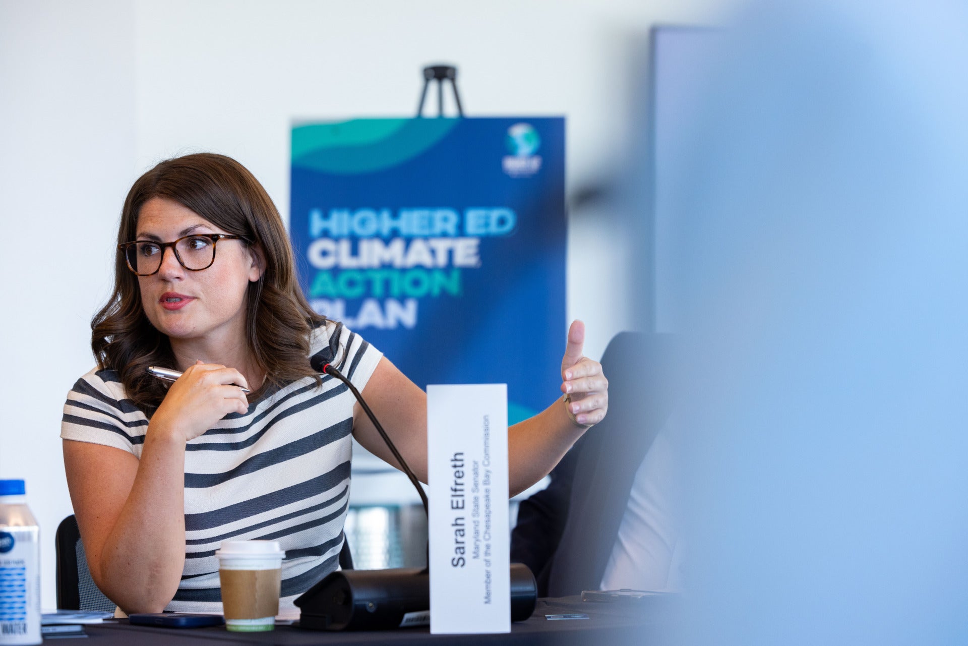 The plan makes it clear: policymakers at every level of government have a major role to play in supporting higher education to achieve its full potential in driving society-wide climate action. Maryland state senators Malcolm Augustine and Sarah K. Elfreth joined the Maryland roundtable to provide a legislative perspective on higher ed’s role in climate action. Sen. Augustine stressed the importance of concrete, measurable successes that lawmakers can bring to the statehouse to convince their colleagues of the importance of investments in higher ed climate action. Whether that’s increases in the number of individuals achieving degrees in clean economy and climate-related fields aligned with the state’s economic development goals, or decreases in the carbon footprints of a state’s colleges and universities, these measures can drive progress at the state policy level that sets higher ed up for success. Recommendations from the plan for policymakers cover all facets of climate action, from encouraging local policymakers to create accessible public transportation routes to higher education campuses to increase enrollment, to asking state legislators to allocate state resources through state bonds, revolving loan funds, and higher education appropriations to help public institutions modernize existing buildings, develop new infrastructure, transition to clean energy, and create hand-on learning opportunities for students.