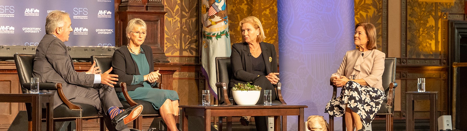 The AMF brought together three former Foreign Ministers from our group – Tzipi Livni of Israel, Mayu Avila of El Salvador, and Margot Wallström of Sweden, to share with students their lessons in leadership and important international perspectives on the issues Secretary Albright most cared about. They addressed the state of democracy around the world, the ability of young people to change their trajectory, and the unique role and challenges for women in leadership positions. Moderated by Edward Luce of the Financial Times, the Ministers also shared their thoughts on her international legacy and personal stories of her impact on their lives and careers.
