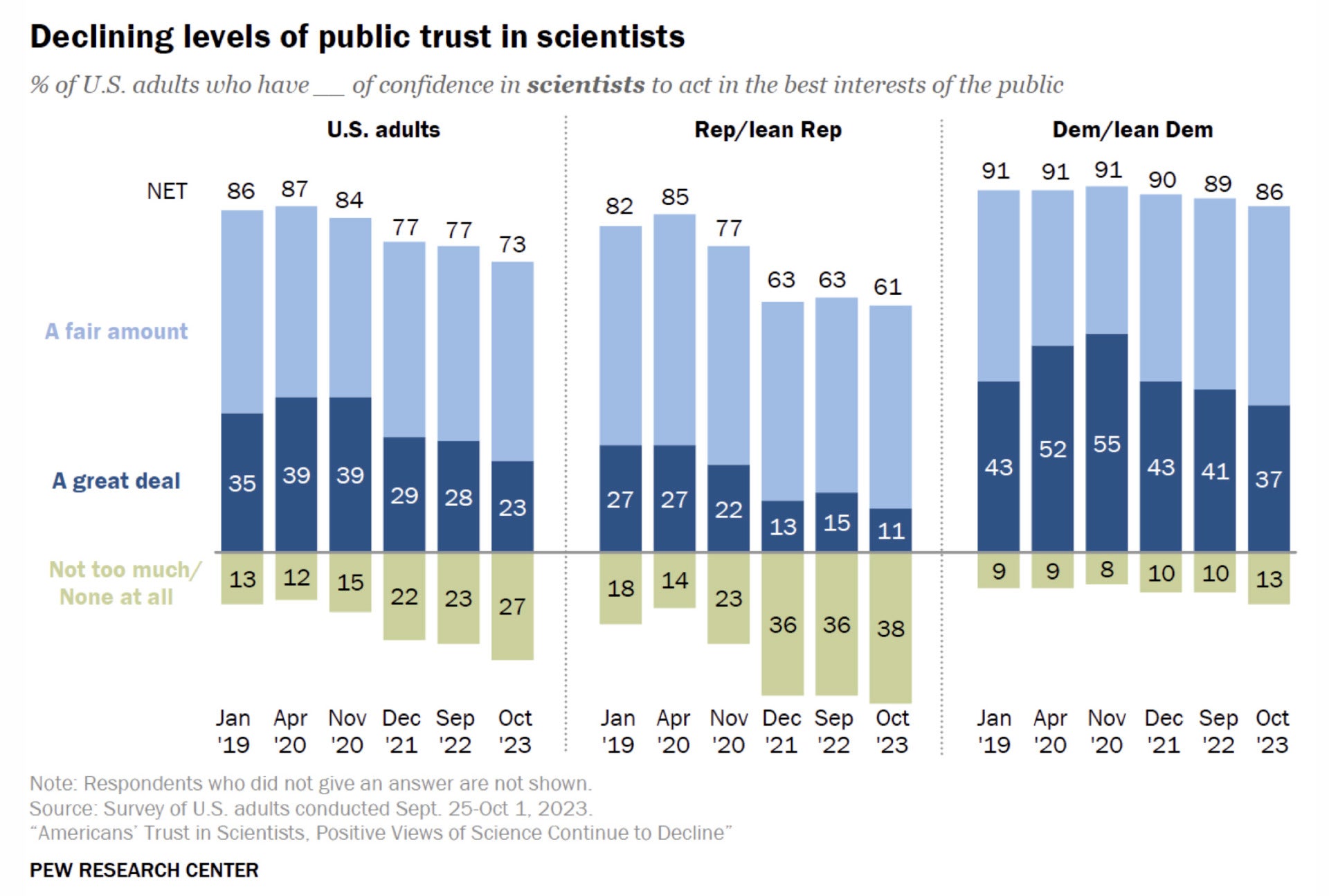 These polling data capture a growing segment of the public that tends to regard science with a skeptical eye and that is correspondingly inclined to challenge findings and recommendations from scientists. Such skeptical sentiments could play out in a myriad of ways. They may lend support to proposals, touted in the “Project 2025” plan that incorporates advice from former advisers to former President Trump, to replace many of government’s career civil servants with political appointees. The influence of science advisors and science-based policymaking is already being diminished by a U.S. Supreme Court ruling that ended a decades-old precedent of legal deference to a federal agency’s interpretation of statutes, known as the Chevron deference doctrine. That 2024 ruling restricts the role of government scientists in guiding how policies can best protect public health and safety.