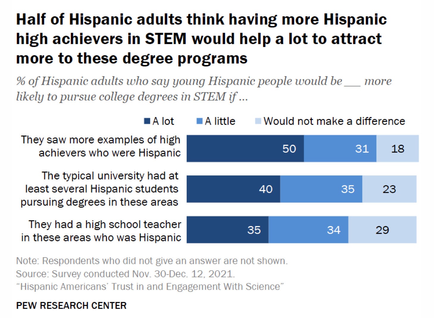 In a survey and focus groups with Hispanic-Americans by Pew Research Center in 2021, Mark Hugo Lopez and I found that the lack of representation in science and allied fields significantly influenced how people saw and experienced science. A majority of Hispanic-Americans (68 percent) describe themselves as being at least somewhat interested in following science news. But just 26 percent of Hispanic adults rated scientists as a professional group as “very welcoming” of Hispanic people in these roles; 29 percent said they are not too welcoming or are not at all welcoming of Hispanic people and another 42 percent said that scientists are somewhat welcoming of Hispanic people in these jobs. Most Hispanic adults said that seeing more high-achieving Hispanics in science, technology, engineering, and mathematics (STEM) would help a lot (50 percent) or a little (31 percent) in attracting more Hispanic people to pursue college degrees in STEM fields.