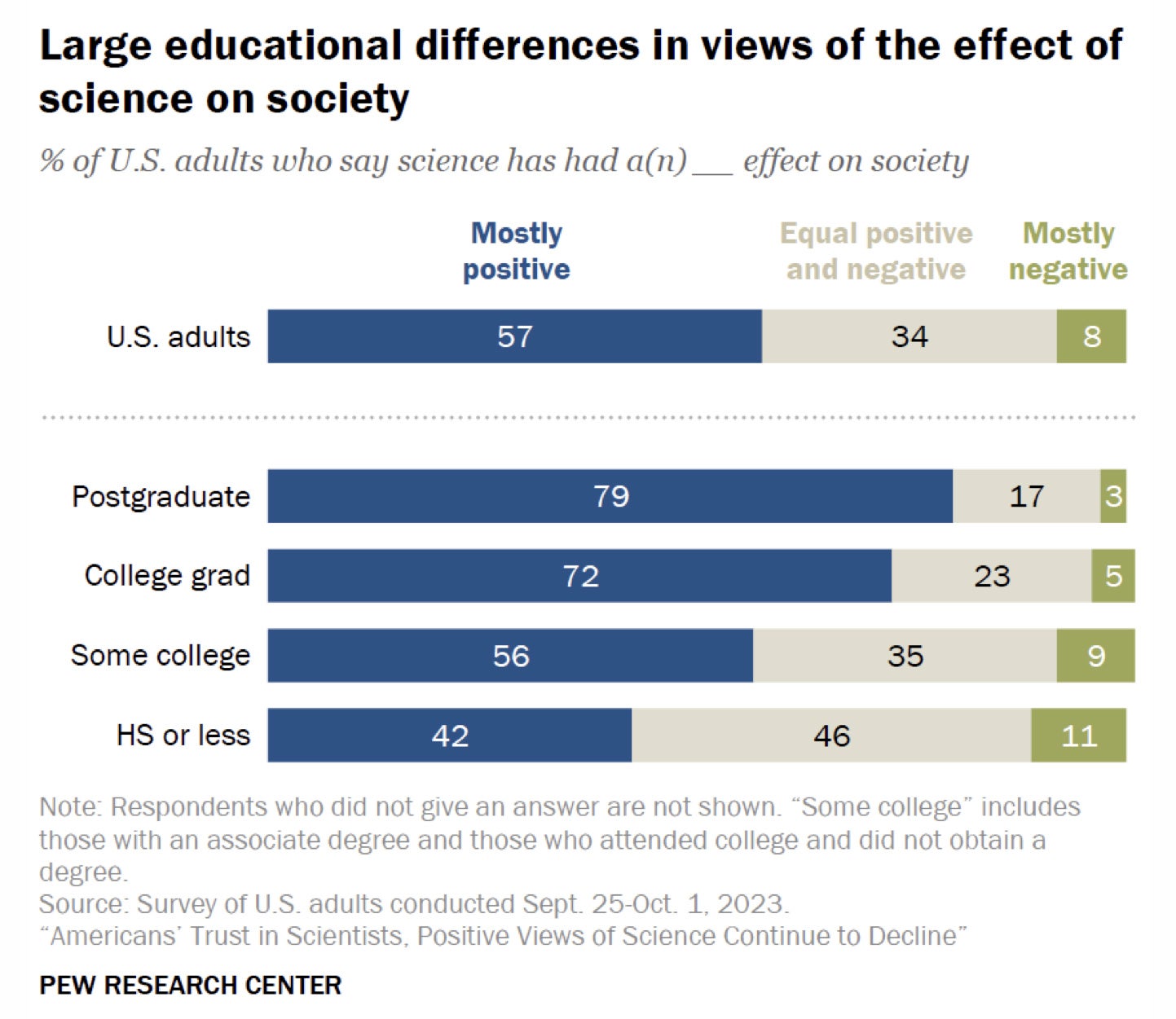 It’s concerning that the people who most strongly support and engage with science increasingly draw from the portion of the population with a college or higher degree. That pattern reinforces an exclusionary image for those with no such degree that science is not for “people like me.” Education-based differences over the value of science and scientists in society are poised to widen further and remain part of the public opinion landscape for years to come.