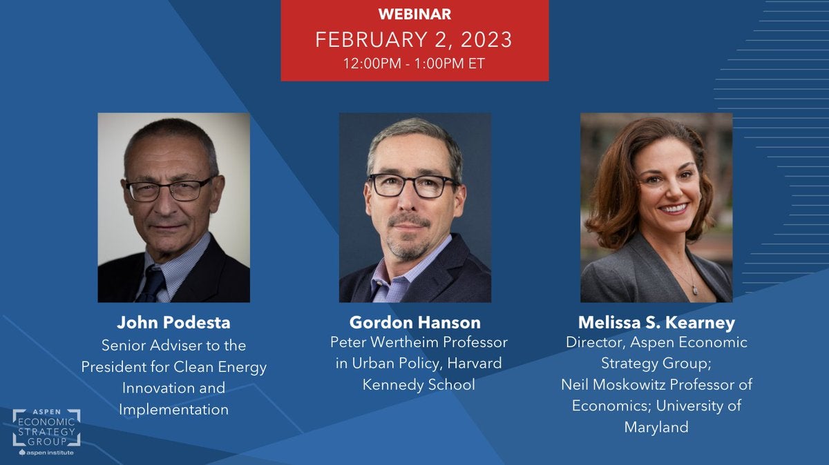 A transition toward more sustainable energy sources is well underway. But reducing the use of fossil fuels will profoundly disrupt the communities that rely on carbon-intensive industries. Join John Podesta, White House Senior Advisor to the President for Clean Energy Innovation and Implementation, and Gordon Hanson, Peter Wertheim Professor in Urban Policy and Faculty Director, Reimagining the Economy Project, Harvard Kennedy School to discuss policy options for easing adjustment to the energy transition. Melissa S. Kearney, Director of the Aspen Economic Strategy Group, will moderate.