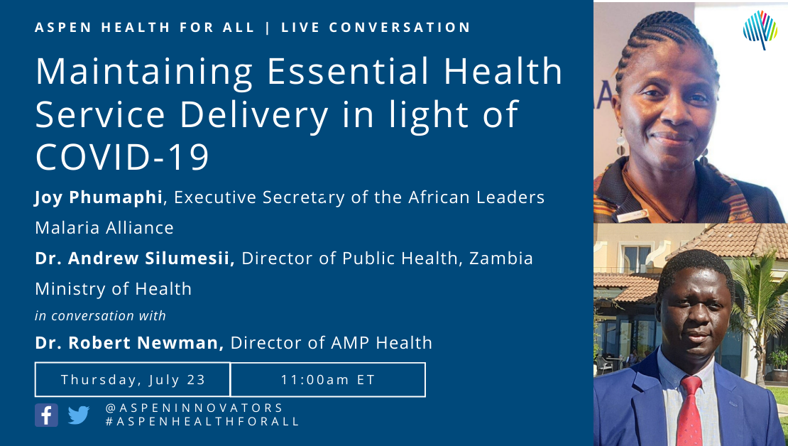 Overcoming the COVID-19 crisis and adapting to the changes that it will inevitably bring will require bold leadership and capable management. What are leaders doing to ensure that we both respond to the direct threat of COVID-19 and maintain essential health services so that we do not stall our progress towards key health goals? What steps do leaders have to take now to recover from the impact of COVID-19 and to strengthen health systems for the future? The Aspen Global Innovators Group held a conversation about the importance of maintaining essential health service delivery in the midst of a global pandemic. The conversation will feature Joy Phumaphi, Executive Secretary of the African Leaders Malaria Alliance and former Minister of Health of Botswana, and Dr. Andrew Silumesii, Director of Public Health, Zambia Ministry of Health. It will be moderated by Dr. Robert Newman, Director of AMP Health.