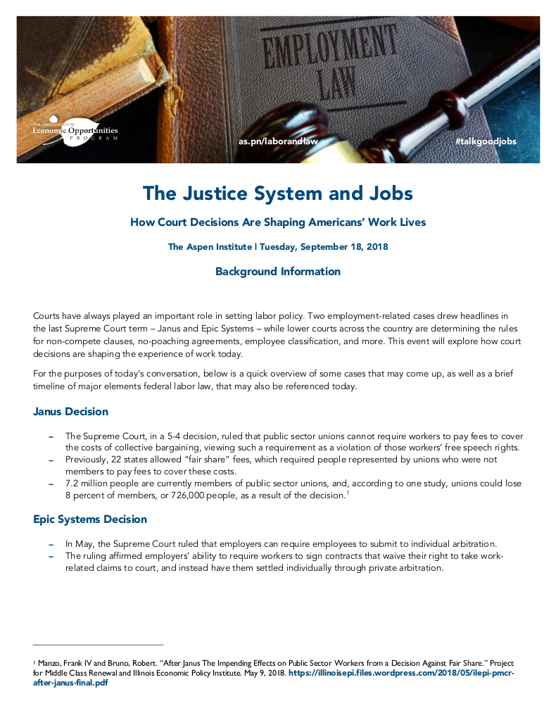 TweetWhile employment-related court rulings can seem technical or dry, the impact of these rulings will be felt by virtually everyone with a job: over 150M wage & salary workers in the US. Learn more from @AspenWorkforce.TweetThroughout history, courts have played a key role in interpreting and enforcing the rules that govern work, balancing the rights and interests of workers and those of the companies they work for. Watch the event from @AspenWorkforce.TweetHear from legal & economic scholars & worker advocates about the critical role that courts have in setting the rules for the employer-employee relationship and the impact on individuals and our economy. @AspenInstitute