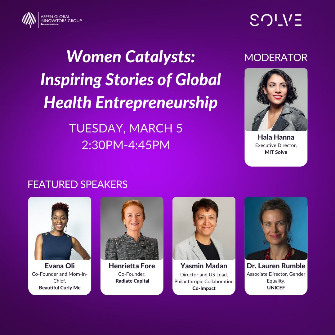This Women’s History Month, the Aspen Global Innovators Group and MIT Solve invite you to celebrate and commemorate the work of women in innovation, highlighting female social entrepreneurs who are addressing critical issues in health, climate, education, and economics. Alongside applauding their achievements, we will champion ongoing efforts needed to foster an inclusive environment that empowers and supports the success of women in innovation.Women play an incredible yet underrepresented role in shaping the global health innovation landscape. Despite pivotal contributions to transformative inventions and advancements, only 28% of the workforce in science and engineering in the United States are women, with a mere 17% receiving venture capital support.