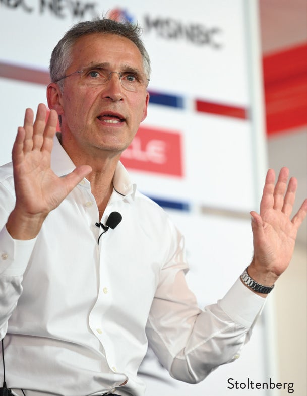 The topics this year included election security, the competition for primacy between the United States and China, and US foreign policy in the Middle East and other global hot spots. But one persistent sentiment endured: the value of alliances and common ground both domestically and overseas. NATO Secretary General Jens Stoltenberg set the tone during the forum’s opening session when he reminded participants that for 70 years, NATO’s global influence has relied on the principle of one for all, all for one. “We are 50 percent of the world’s military might,” he told NBC correspondent Courtney Kube. “We are stronger than any other potential adversary so long as we stay together. The most important thing is the resolve, the political will, the unity of the alliance. As long as that is in place, then we are safe.”