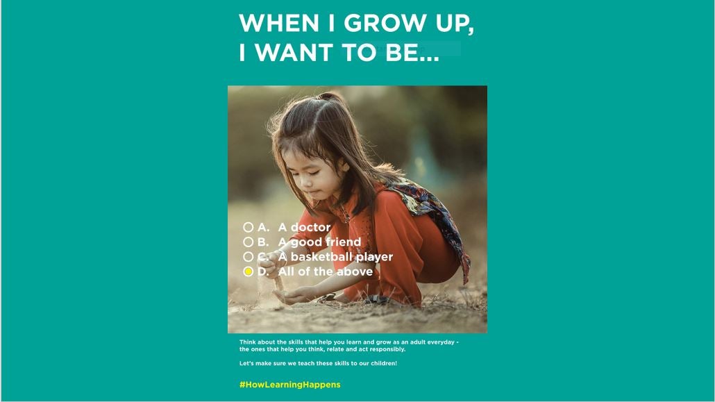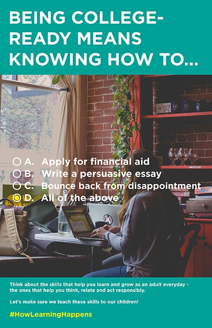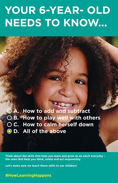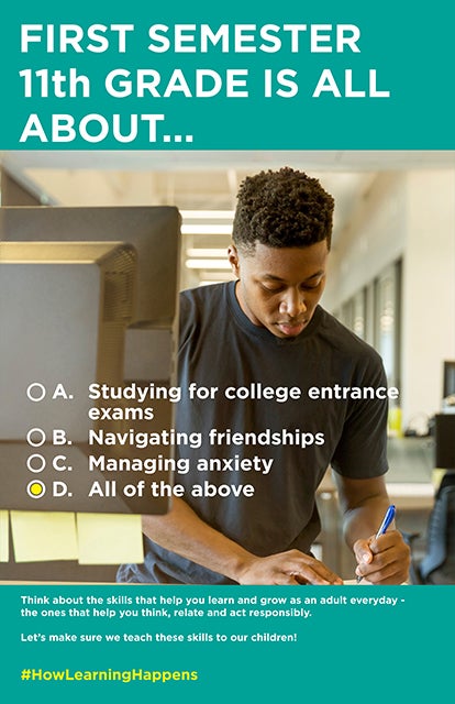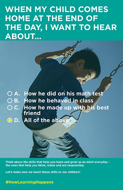 This series of multiple choice options is a clever play on the standardized test format, intended to underscore the importance of the array of skills and competencies that are a part of all learning and development. The series reinforces everything that families, educators and students themselves understand about the intertwining of social, emotional, and academic factors in success at every stage of a young person’s life. In both imagery and language, this series is deliberately provocative, with a slightly cheeky tone that sets it apart from conventional education messages, appeals to young people, and makes it ideal for visual display at both school and after-school settings and for capturing attention on social media.