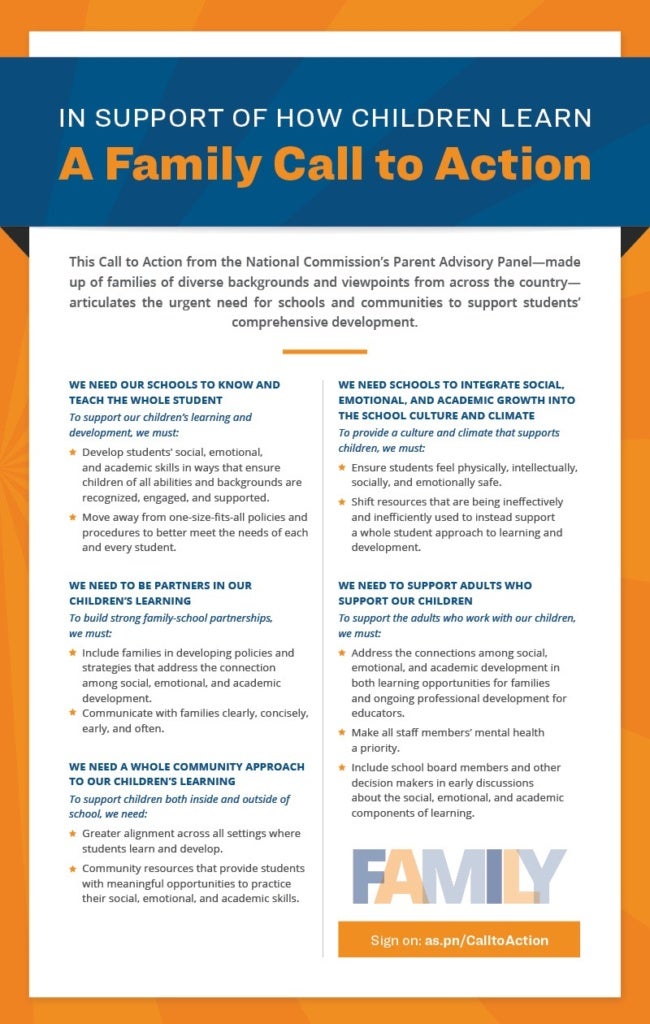 Download the full Family Call to Action Next steps: 1. Share this report with fellow parents and ask them to sign on too. And share the report with your children’s teachers, schools, and community leaders. Find out what they’re already doing to build students’ social, emotional, and academic skills. 2. For more information about supporting students’ comprehensive development, including on-the-ground examples of this work and the research behind it, see: As.pn/EdResources. 3. Stay tuned for the Commission’s final recommendations, which will be released in late 2018 to help schools and communities fully integrate social and emotional development with academic instruction.