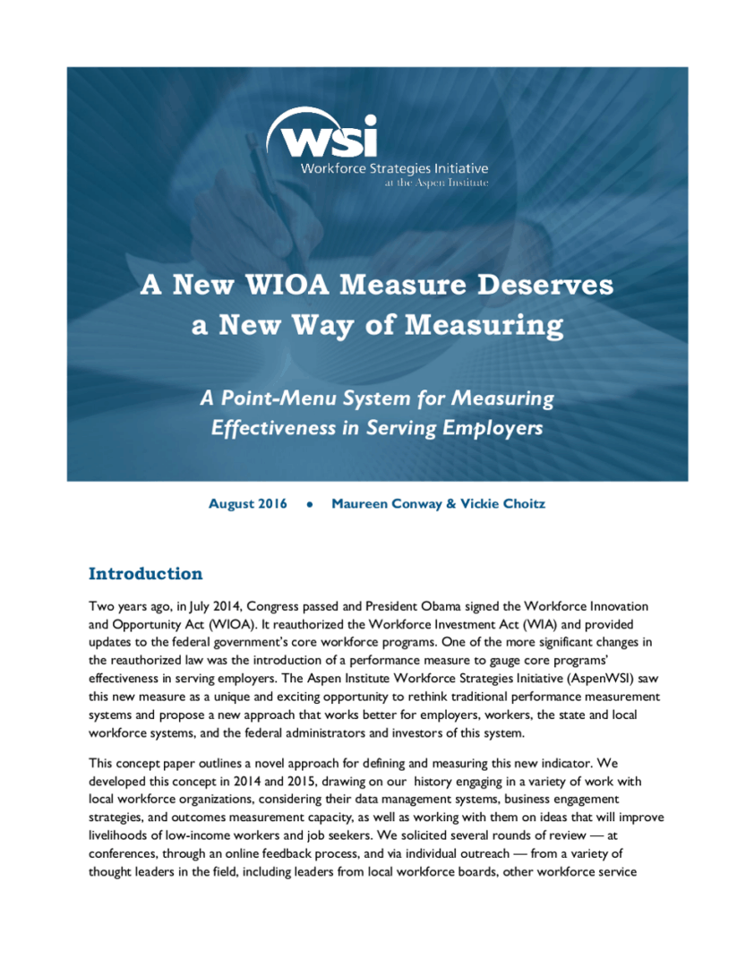 In the final WIOA regulations released in late June of this year, the departments of Labor and Education proposed state pilot programs to test various indicators of measuring core programs’ effectiveness in serving employers. The regulations specifically mentioned consideration of AspenWSI’s point-menu system as a pilot. You can read more about the proposed point-menu system in our final publication describing this approach: A New WIOA Measure Deserves a New Way of Measuring: A Point-Menu System for Measuring Effectiveness in Serving Employers.
