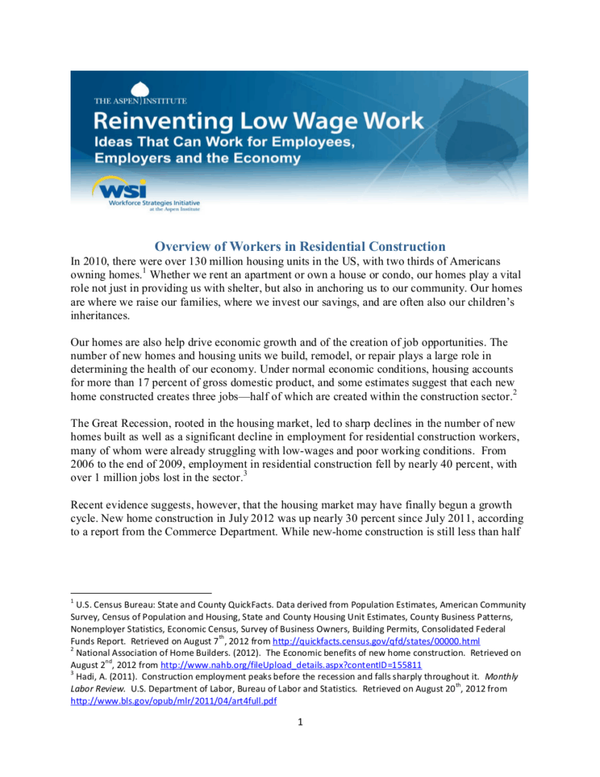 This resource provides an overview of residential construction work in the United States including information about the demographics of workers in the industry, the size of the workforce, wages and benefits, and working conditions. The resource was developed as part of an event AspenWSI held on October 18th, 2012 titled “The Housing Market’s Foundation: A Discussion on the Workforce in Residential Construction,” The Housing Market’s Foundation:  A Discussion on the Workforce in Residential Construction (link to video) which is part of AspenWSI’s series, “Reinventing Low-Wage Work: Ideas That Can Work for Employees, Employers and the Economy.”