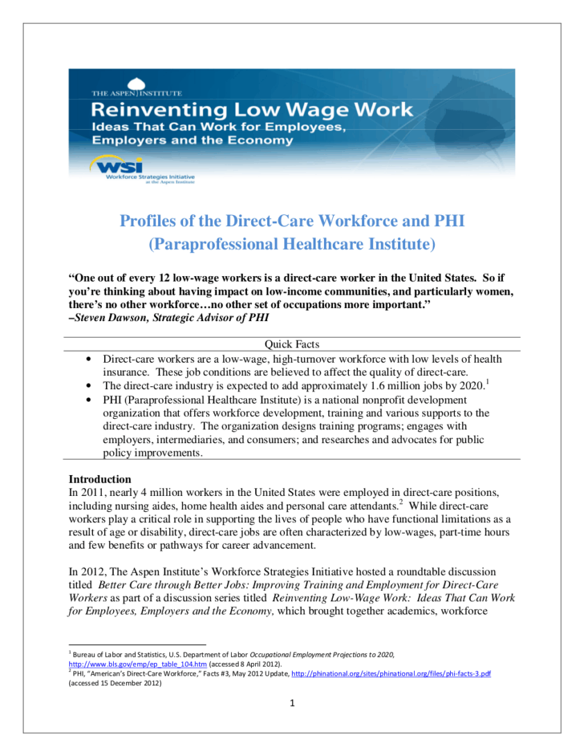 This report provides an overview of work in the direct-care industry and profiles PHI (Paraprofessional Healthcare Institute), an organization dedicated to improving employment for direct-care workers in the US.
