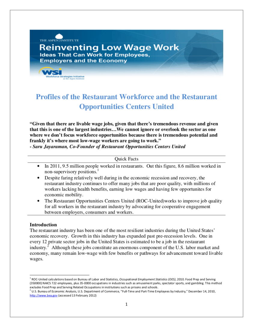 This report details the state of low-wage work in the restaurant industry and provides a profile of Restaurant Opportunities Center-United, an organization striving to empower low-wage restaurant workers, employers, and consumers to collectively improve job quality in the industry.