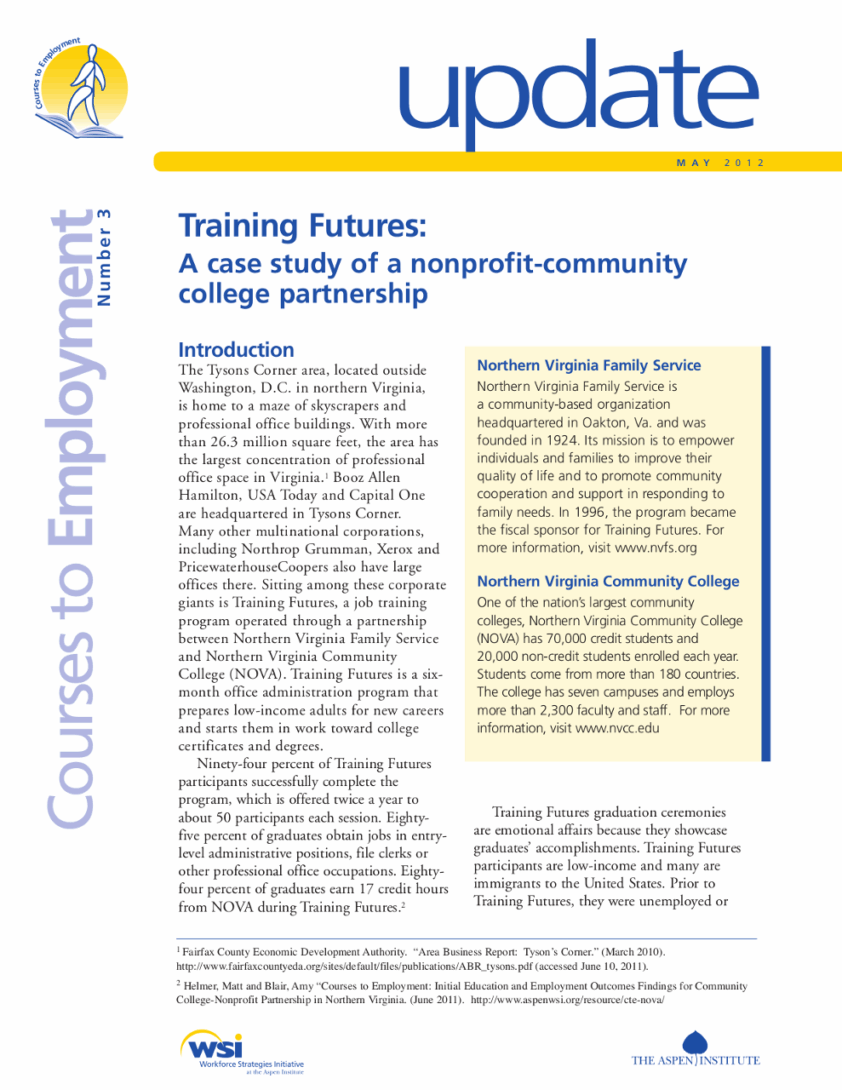 This issue of Update looks at how Northern Virginia Family Service, a nonprofit organization, and Northern Virginia Community College partner together to provide Training Futures, a six month training program designed to help low-income adults in Northern Virginia start new careers in office administration and advance towards degrees and certificates in college. We share information about participants and the education and employment outcomes they achieve, program design, recruitment strategies, curriculum, training approach, services provided, employer involvement and funding. We also discuss the history of the program and partnership, partners’ roles and responsibilities, key staff members, planning processes, data management, and key innovations and lessons learned from the partnership. This case study builds on research done through Courses to Employment, a demonstration project funded by the Charles Stewart Mott Foundation that investigated how community college-nonprofit partnerships can help low-income adults succeed in college and the labor market.
