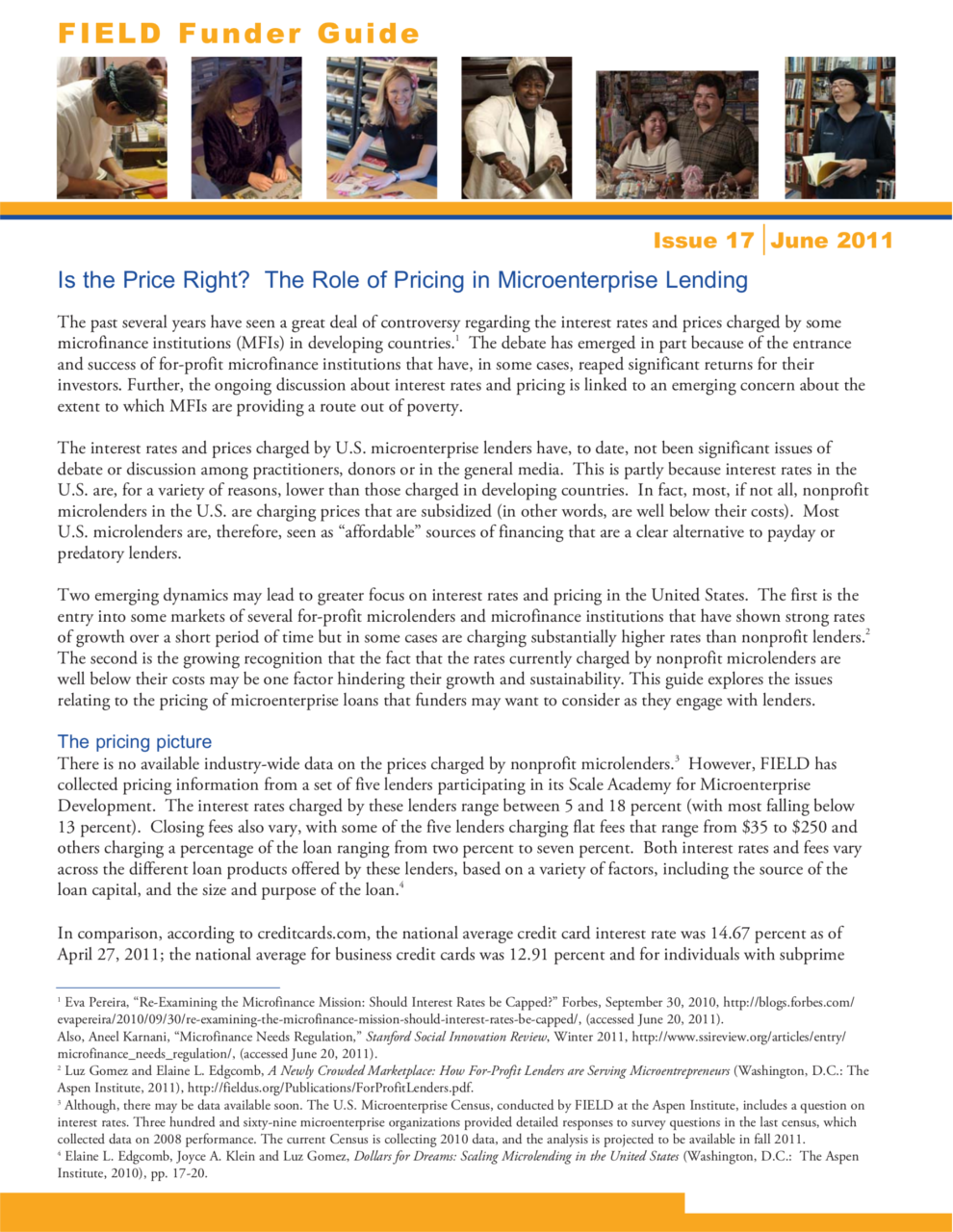 This guide explores the issues relating to the pricing of microenterprise loans that funders may want to consider as they engage with lenders.