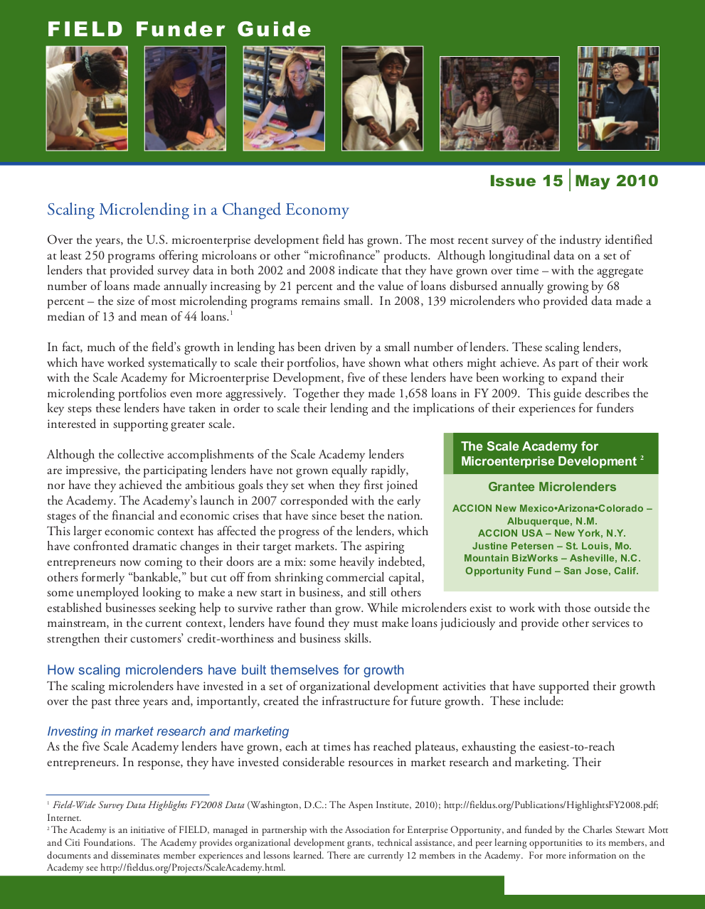 This publication discusses the experiences of five leading microfinance organizations, which participate in the Scale Academy for Microenterprise Development.