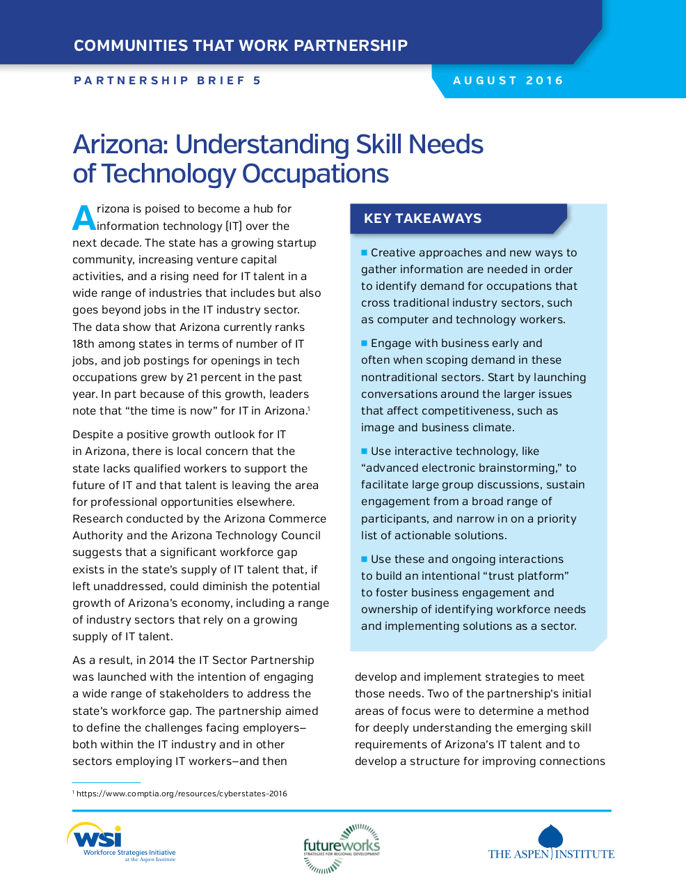 Despite a positive growth outlook for IT in Arizona, there is local concern that the state lacks qualified workers to support the future of IT and that talent is leaving the area for professional opportunities elsewhere. As a result, in 2014 the IT Sector Partnership was launched with the intention of engaging a wide range of stakeholders to address the state’s workforce gap. The partnership aimed to define the challenges facing employers—both within the IT industry and in other sectors employing IT workers—and then develop and implement strategies to meet those needs.