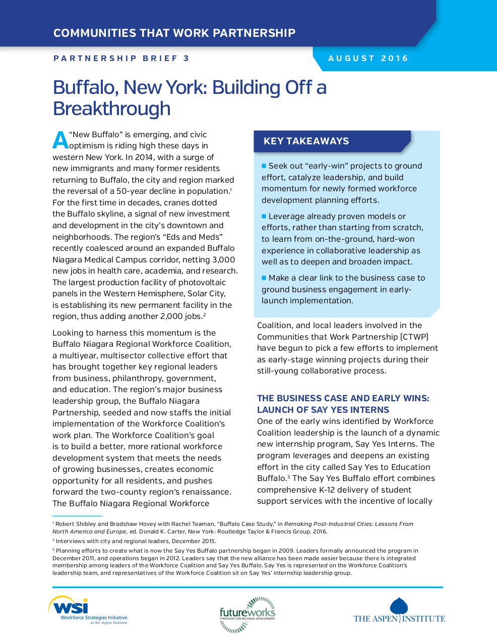 A “New Buffalo” is emerging, and civic optimism is riding high in western New York. In 2014, the city and region marked the reversal of a 50-year decline in population amidst a burst of economic revitalization, including the creation of new jobs in health care, academia, research, and clean energy. Looking to harness this momentum is the Buffalo Niagara Regional Workforce Coalition, a multiyear, multisector collective effort that has brought together key regional leaders from business, philanthropy, government, and education.
