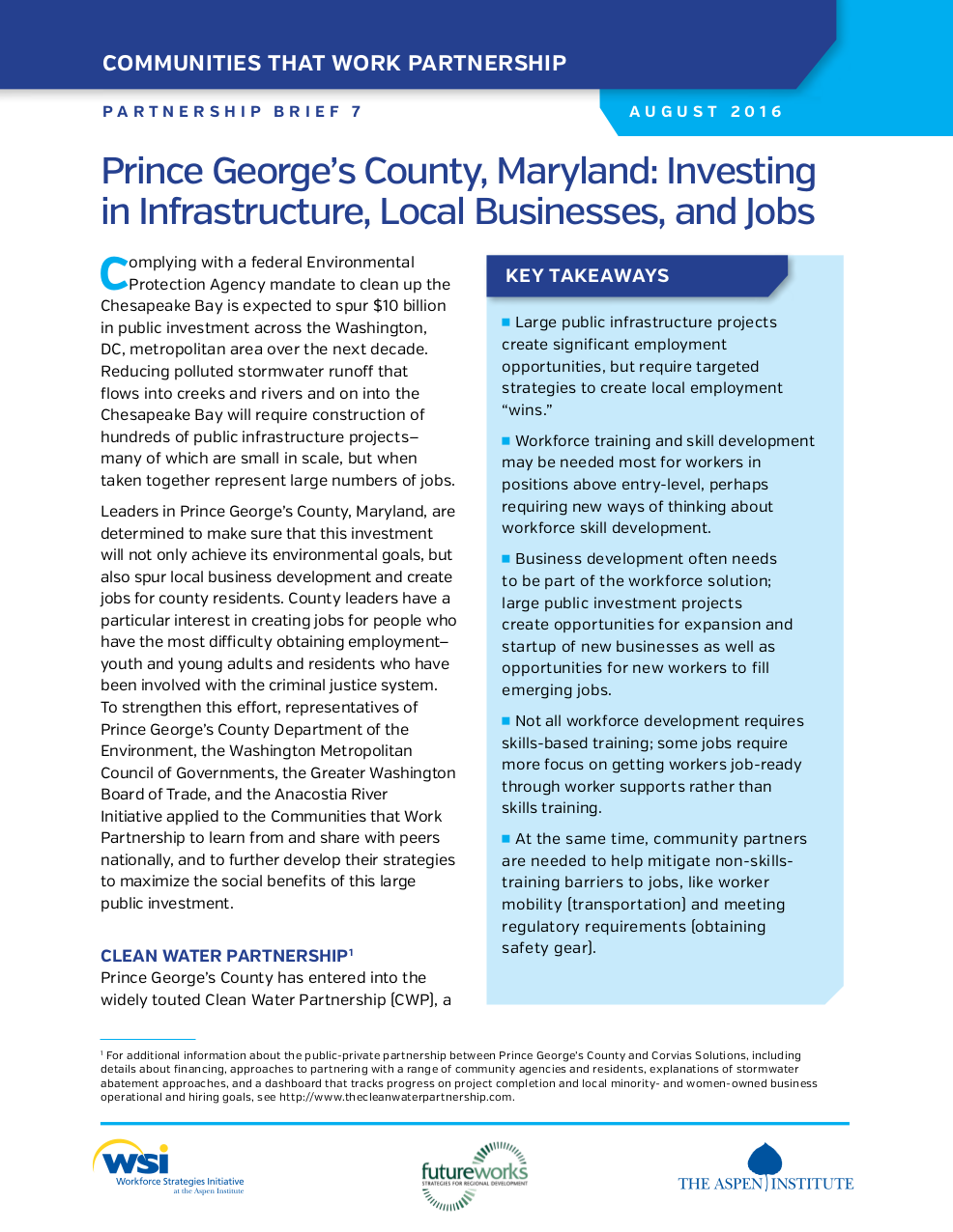 Complying with a federal mandate to clean up the Chesapeake Bay is expected to spur $10 billion in public investment across the DC metro area over the next decade. Leaders in Prince George’s County, Maryland, are determined to make sure that this investment will not only achieve its environmental goals, but also spur local business development and create jobs for county residents. To strengthen this effort, representatives from the public, private, and nonprofit sectors applied to the CTWP to learn from and share with peers nationally, and to further develop their strategies to maximize the social benefits of this large public investment.